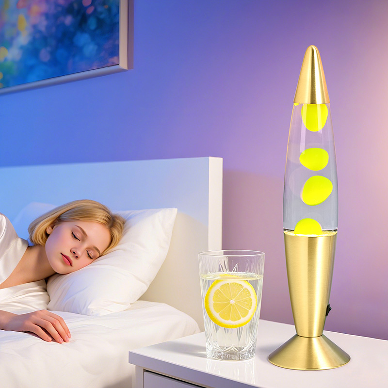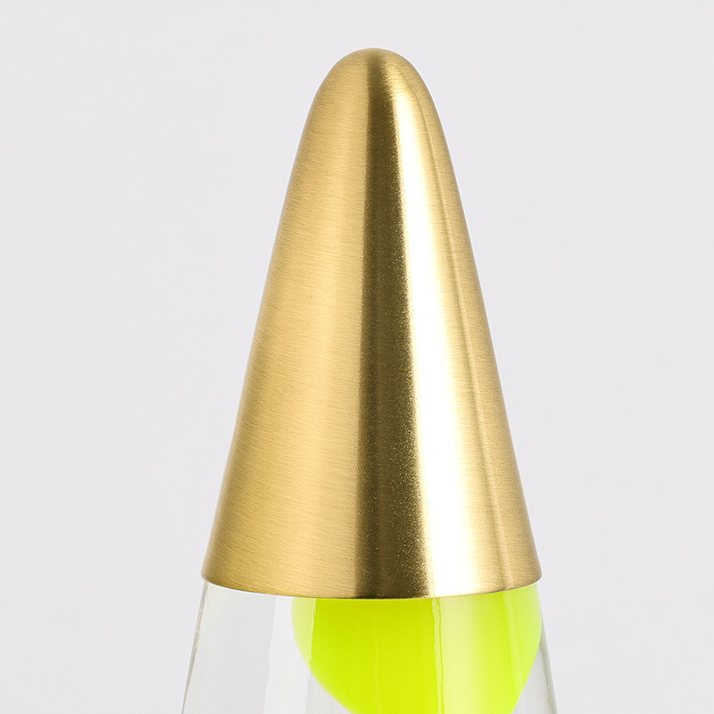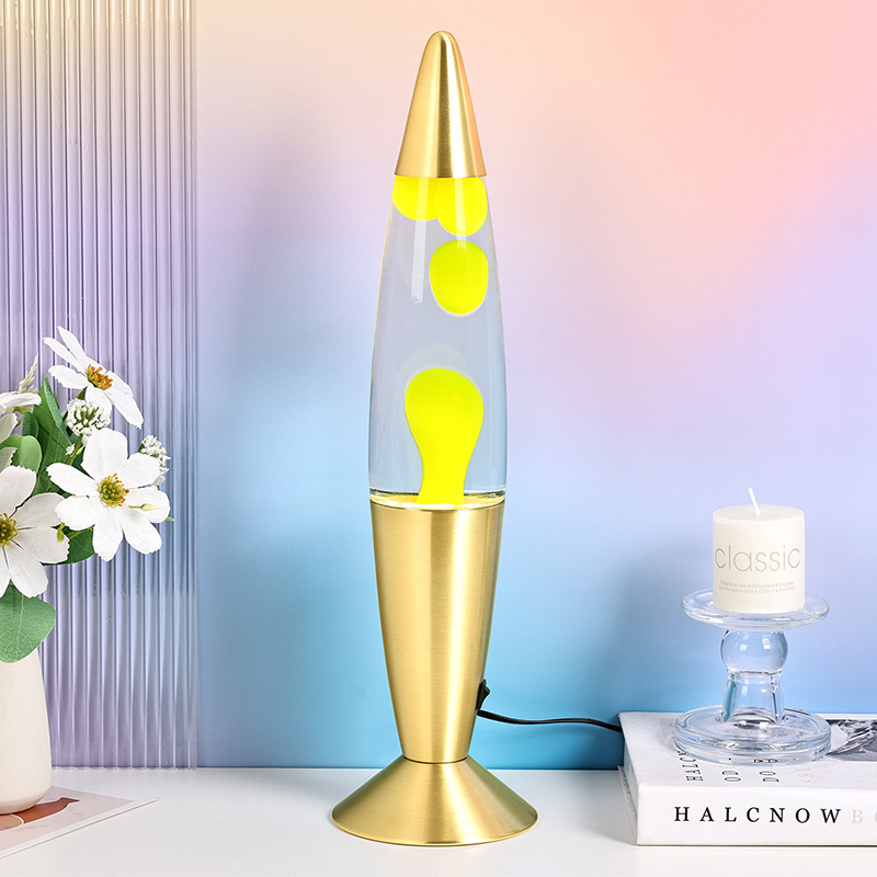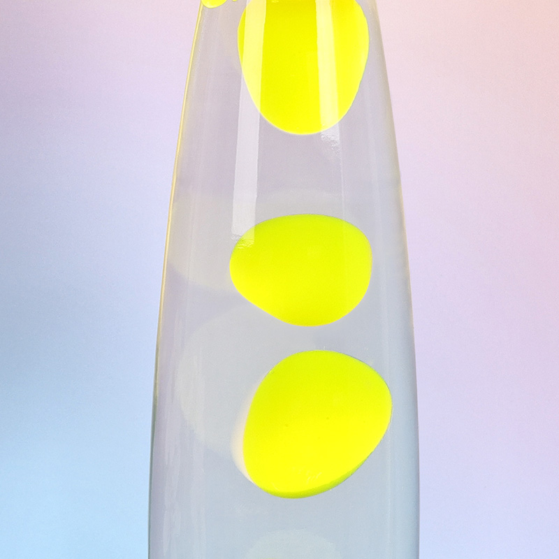 24В16 дюймдік сәнді қызғылт сары лава шамының балауыз шамының ішінде мөлдір шыныда таза су және жасыл балауыз бар. Қыздырылғаннан кейін балауыз суда тұрақты емес жүзеді, бұл өте жоғары бағаланады.
