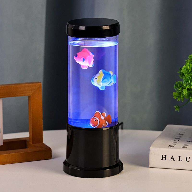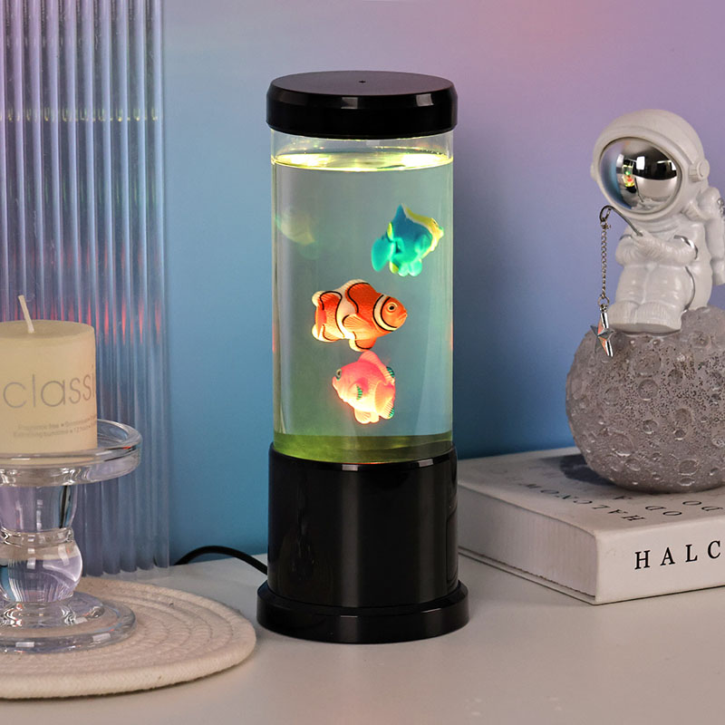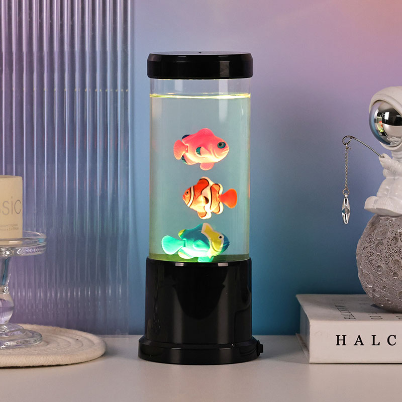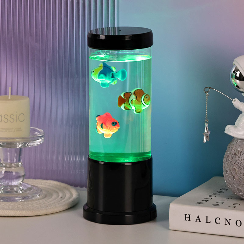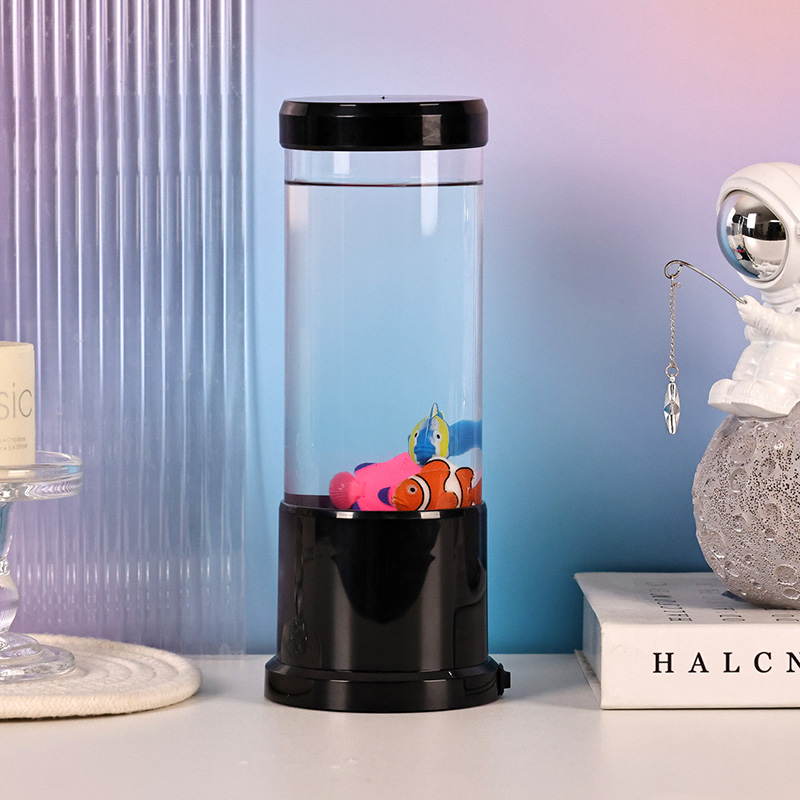 Таңқаларлық жарықдиодты балық шамымен таныстыру – үйіңізге су асты әлемінің сиқырын әкелетін заманауи дизайн мен су сүйкімділігінің керемет үйлесімі. Жылтыр қара сыртқы түрімен, талғампаз цилиндрлік пішінімен және тартымды ішкі қозғалысымен бұл сәндік шам жай жарықтандыру ғана емес —