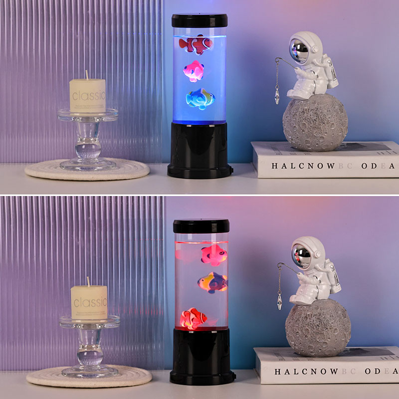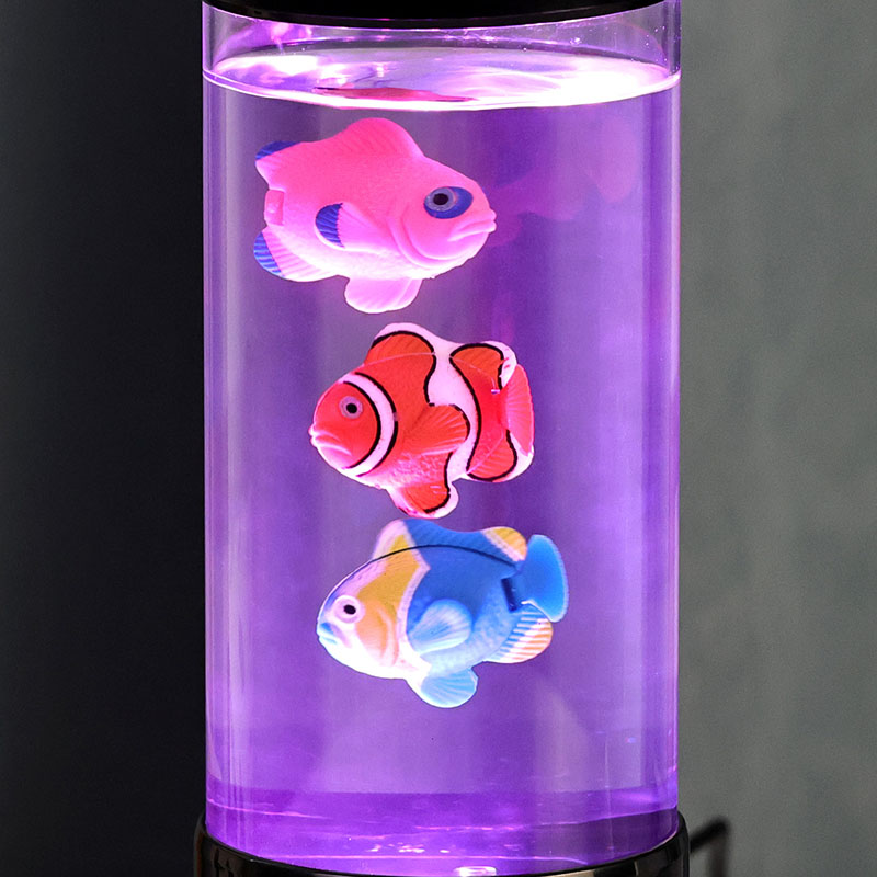 Мөлдір резервуардың ішінде тірі жасанды балықтар төменнен көтерілетін көпіршіктердің нәзік ағындарымен синхронды түрде жоғары және төмен сырғанайды. Ашық түстермен және шынайы текстуралармен жасалған бұл әдемі егжей-тегжейлі балықтар ішкі ауа сорғысы арқылы жасалған жұмсақ ағынның әсерінен табиғи түрде жүзетін сияқты. Қозғалыс тыныштандыратын және ұйықтататын, стрессті азайтуға және релаксацияны жақсартуға көмектесетін тыныштандыратын көрнекі тәжірибе жасайды.
