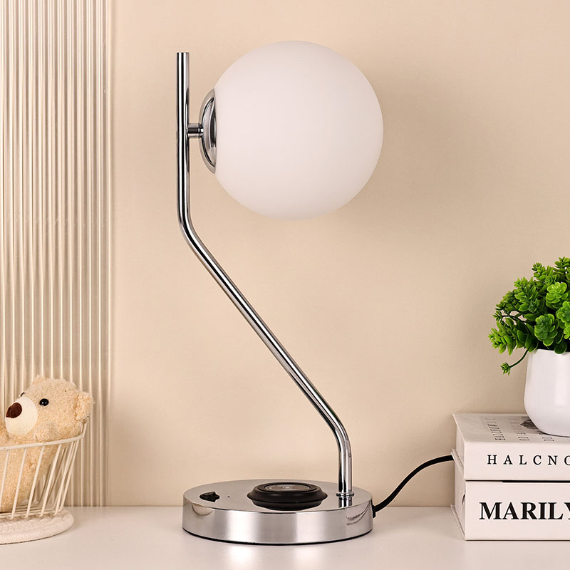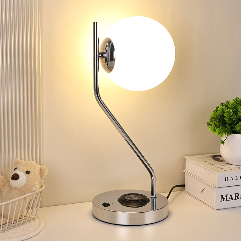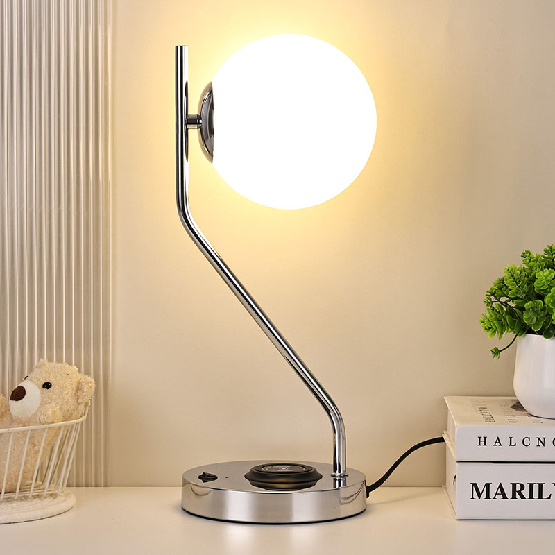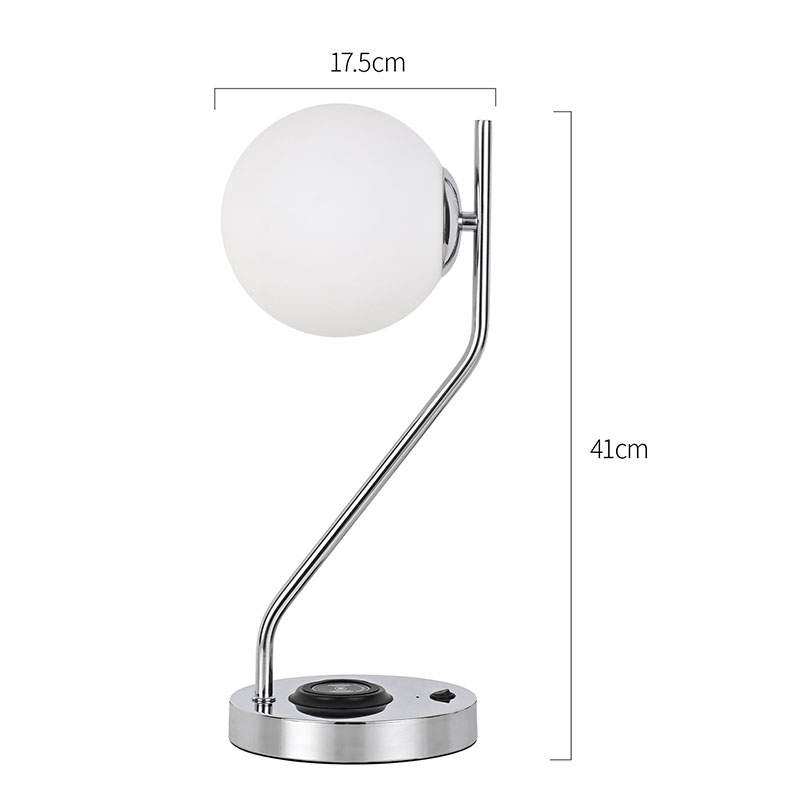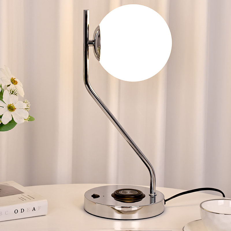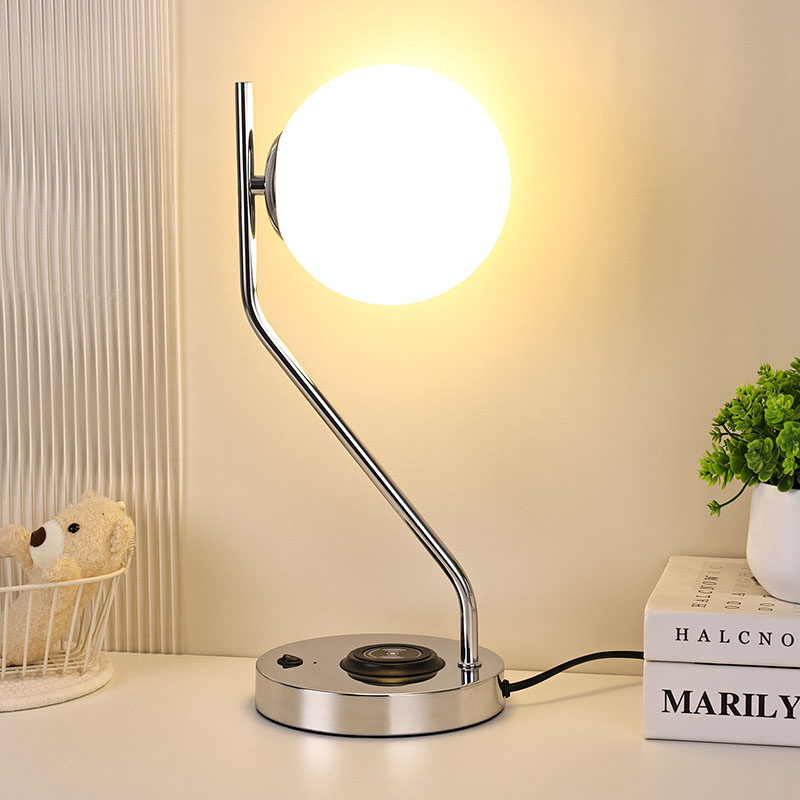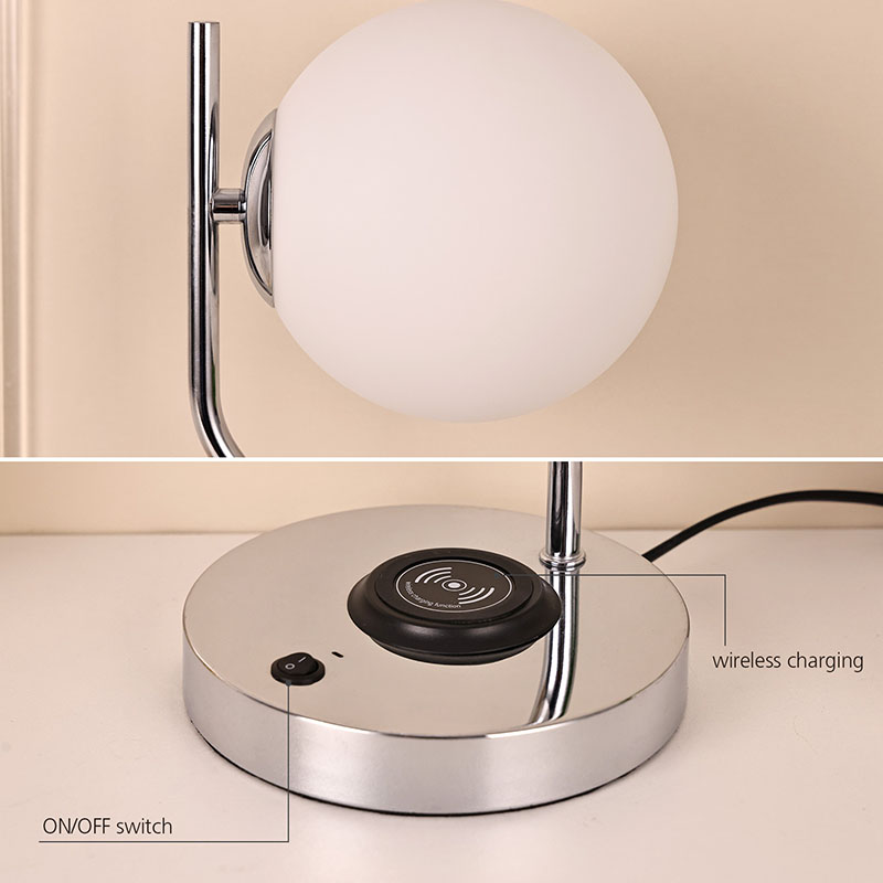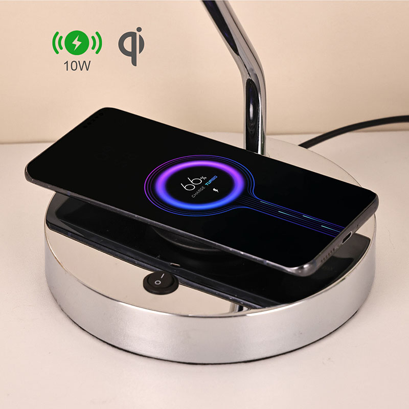 Сымсыз зарядтау құрылғысы бар әйнек көлеңкелі үстел шамы, сондай-ақ металл сымсыз ұялы телефонды зарядтау негізімен жабдықталған. Жылдам зарядтау үшін сымсыз зарядтау мүмкіндігі бар телефонды жай ғана негізге жайлап қойыңыз.