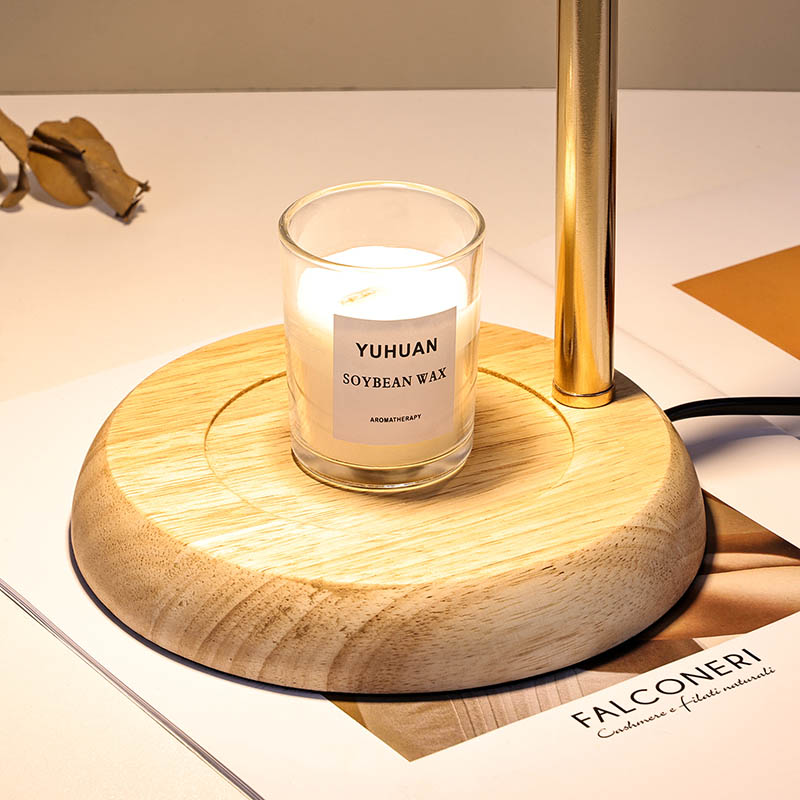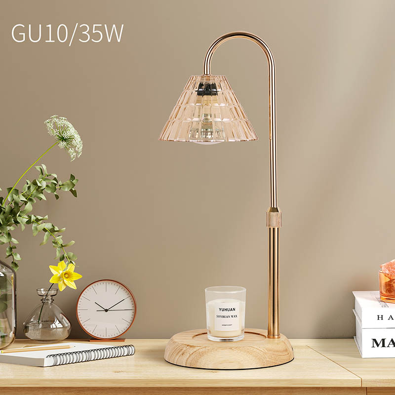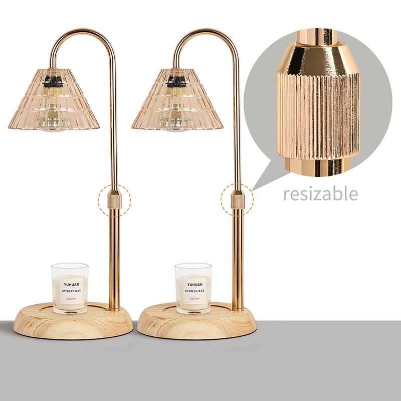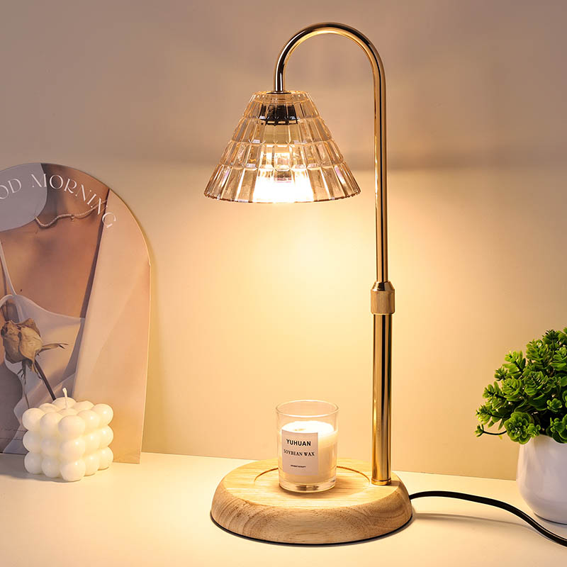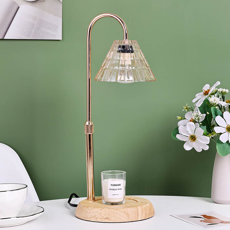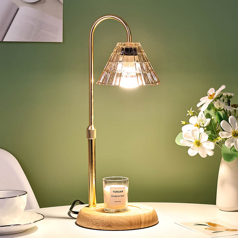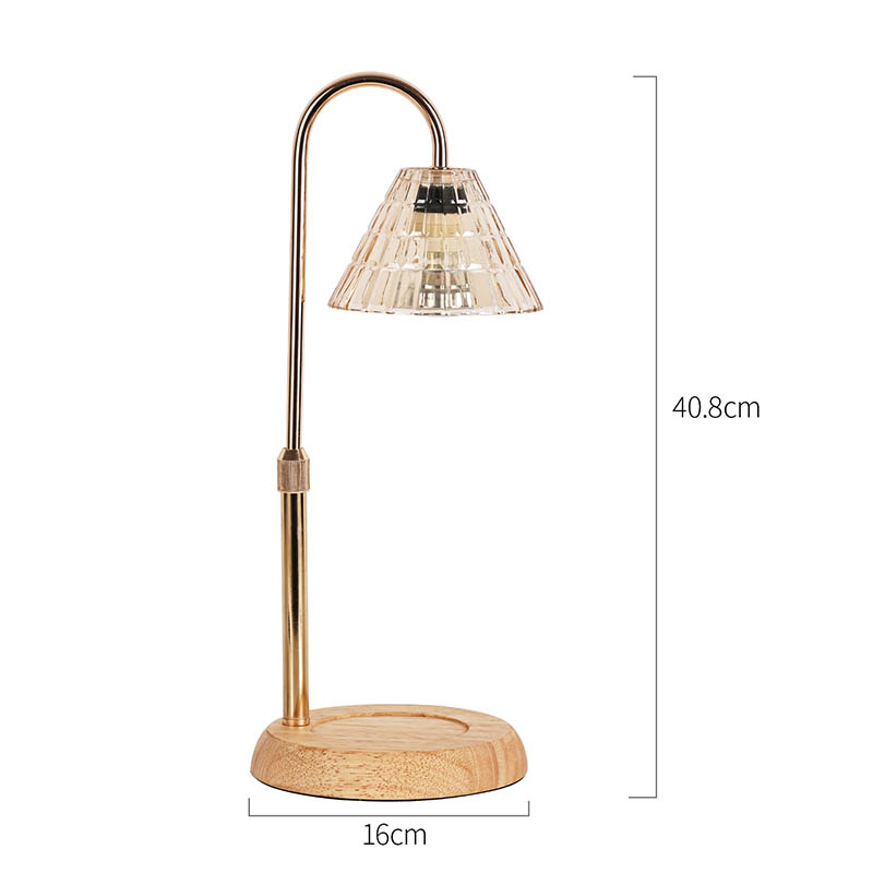 Биіктігі реттелетін шыны көлеңкелі үстел шамы - ағаш негізі бар дәстүрлі шамдан және алтын түсті металл шам бағанынан тұратын дәстүрлі дизайн стилі.