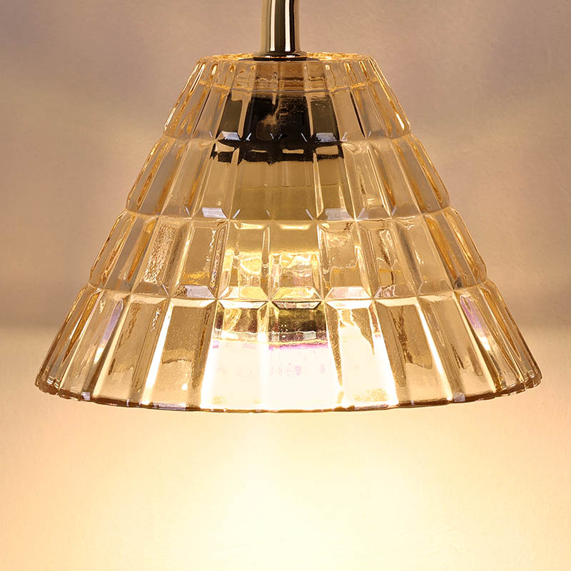 Абжур мөлдір шыныдан (акрил) жасалған, ал жылы түсті жарық оқуға өте қолайлы. Биіктігі реттелетін шыны көлеңкелі үстел шамының ең үлкен сатылым нүктесі оның дизайнына қосымша, айналмалы түймесі бар биіктігі реттелетін шам бағанасы болып табылады және жарықтандыру ауқымын биіктікке қарай реттеуге болады.