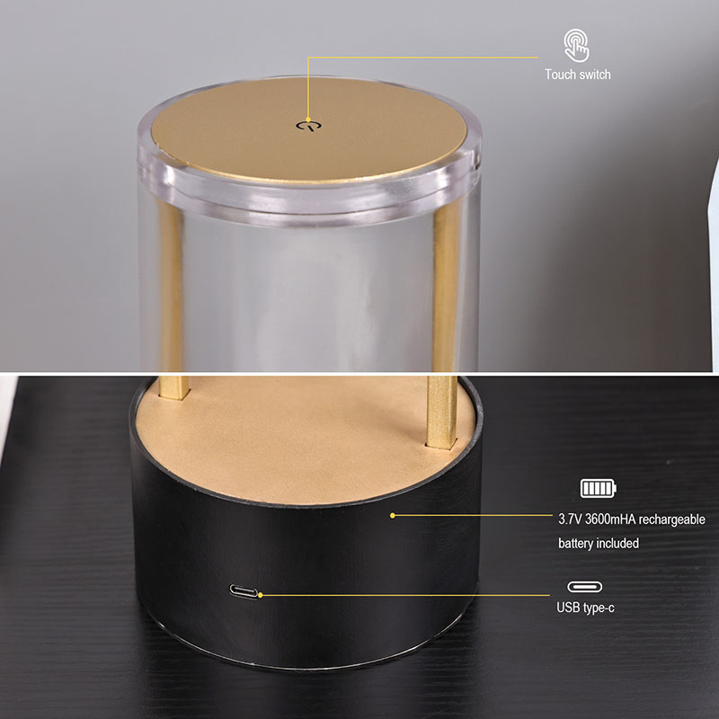 Шам стиліндегі шағын үстел шамының үстіңгі жағы сенсорлық жарық қосқышы болып табылады, төменгі жағында c типті қайта зарядталатын зарядтау басы бар. Үстіңгі жағы мөлдір акрил жабынынан, ал төменгі бөлігі металл негізден тұрады. Жалпы дөңгелек құрылым жылжымалы жарықтандыруға мүмкіндік береді