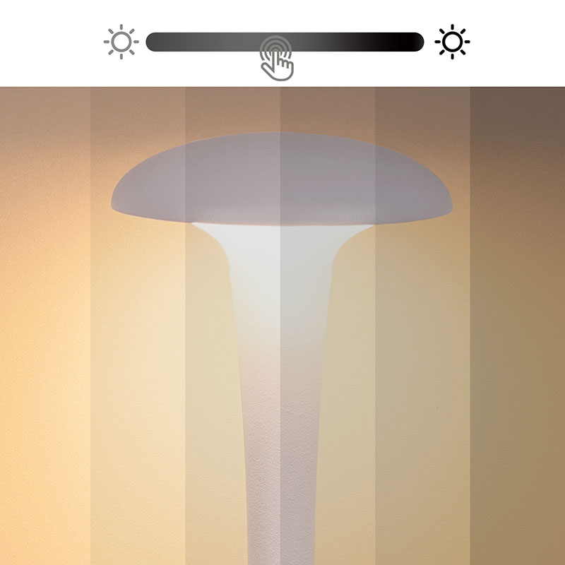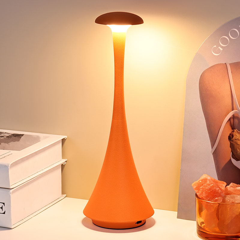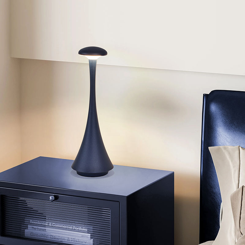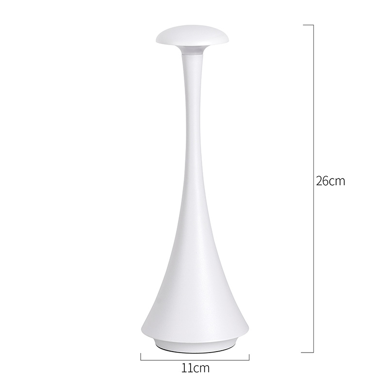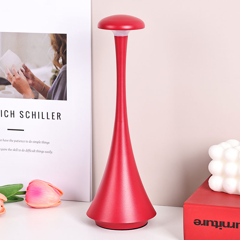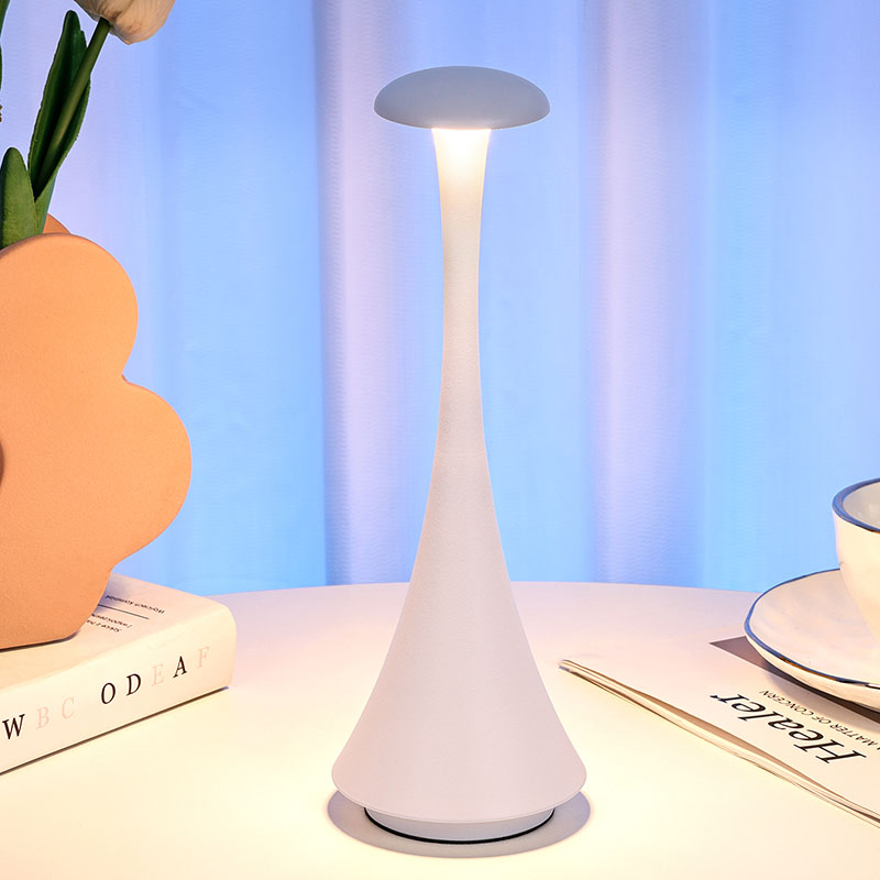 Күңгірттеу қосқышын түртіңізҚайта зарядталатын батареясы бар жаңа дизайндағы жарықдиодты үстел шамы қарапайым және тегіс сызықтары мен эргономикалық пішіні, саңырауқұлақ пішінді және ине жағының дизайны және металл жылы жарық диодты үстел шамы тек практикалық жарықтандыру құралы ғана емес,