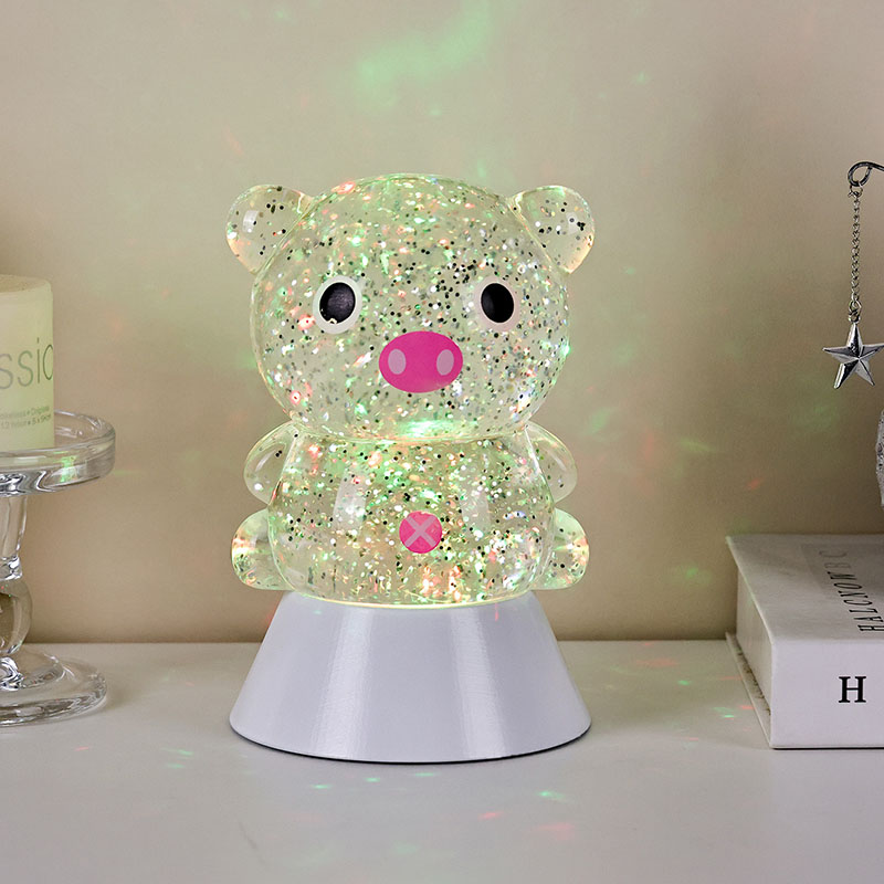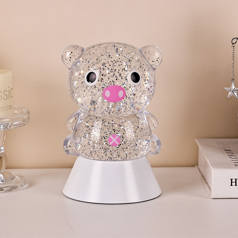 Жалпы дизайнда сүйкімді және сүйкімді шошқа бейнесі бар, оның дөңгелек және толық контурлары үлкен көздерімен, қызғылт тұмсығымен және сүйкімді кішкентай құлақтарымен ересектердің де, балалардың да жүрегін бірден жаулап алады. Мөлдір шайыр қабығы жарқыраған түсті блесткимен және арнайы сұйықтықпен толтырылған, ол шамдар қосылған кезде сұйықтықпен ақырын ағып, шошқа денесінің ішінде ағып жатқан жұлдызды өзен сияқты армандаған көрнекі әсер береді. Ашық түстер автоматты түрде ауысып, жұмсақ қызғылт және арманшыл күлгіннен жаңа көк пен жасылға ауысып, ертегі әлемін шындыққа айналдырғандай бейбіт, бірақ сиқырлы атмосфераны тудыратын түстердің кемпірқосақына үздіксіз ауысып отырады.