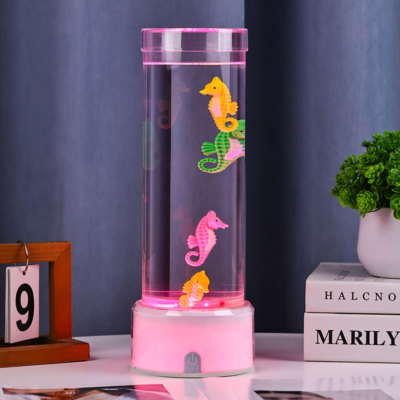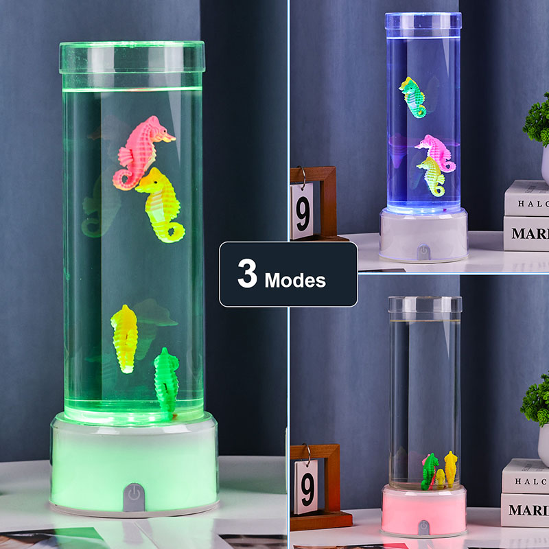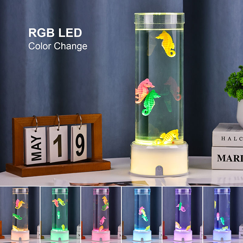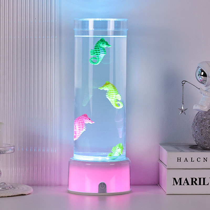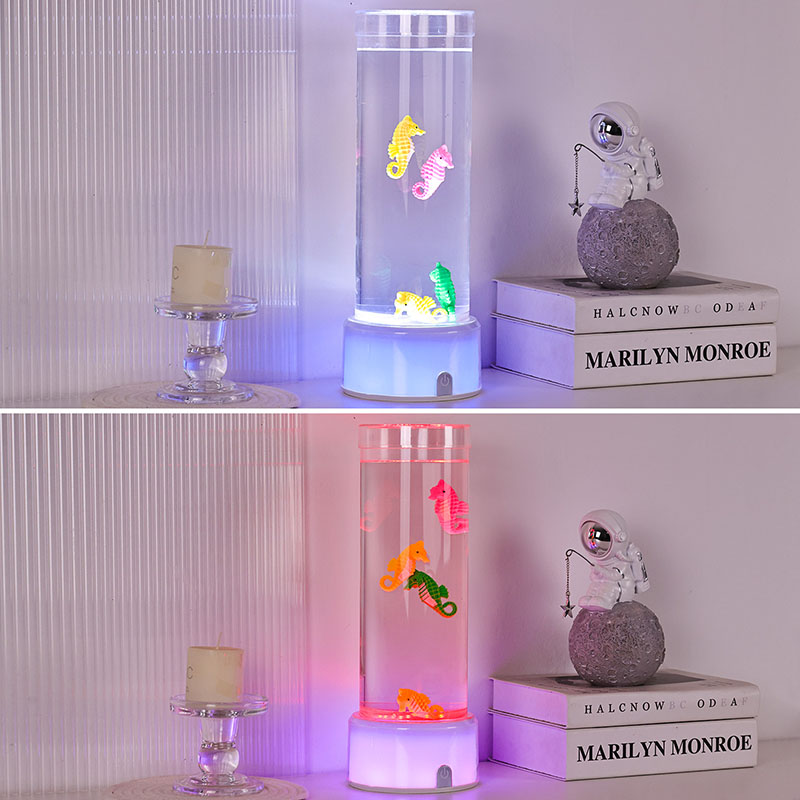 RGB түсін өзгертетін теңіз жылқысының сәндік шамымен таныстыру. Кез келген кеңістікке тыныштық пен сұлулық әкелуге арналған теңіз сүйкімділігі мен заманауи жарықтандыру технологиясының әсерлі қоспасы Бұл талғампаз шамның мөлдір цилиндрлік сұйықтық камерасында ақырын жүзетін теңіз жылқысы фигуралары бар.
