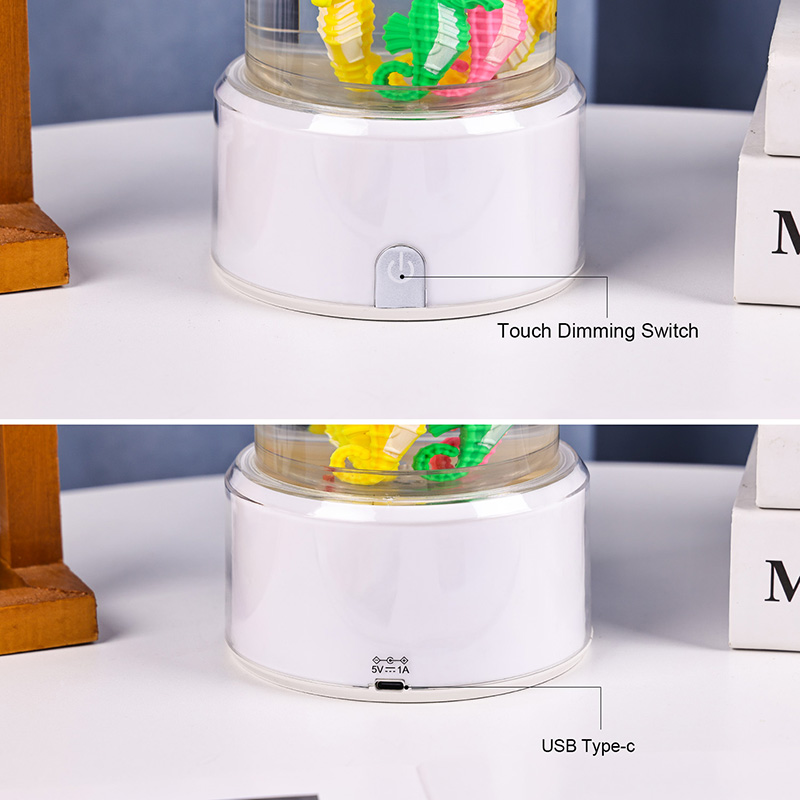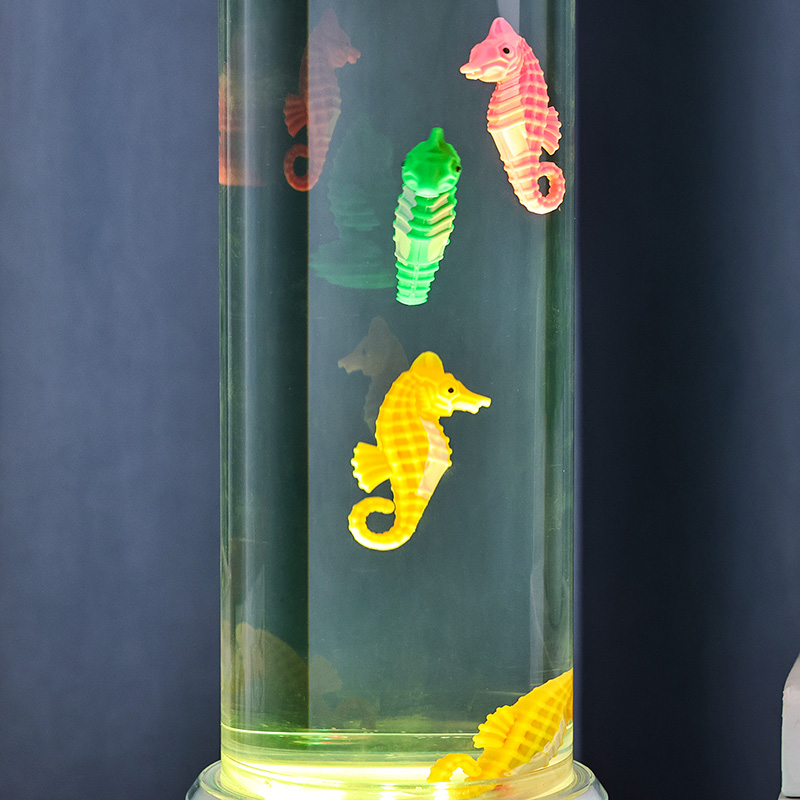 мұхиттың тыныштығын тудыратын таң қалдыратын су астындағы көрініс Бүкіл құрылғы қауіпсіздіктің тұрақтылығы мен ұзақ жұмыс істеуін қамтамасыз ететін жоғары сапалы берік пластиктен жасалған. Шамның биіктігі шамамен 12 дюймді құрайды, улы емес сұйықтықпен толтырылған жылтыр мөлдір түтікпен және теңіз жылқысының түрлі-түсті әшекейлерімен ерекшеленеді. Әрбір теңіз жылқысы егжей-тегжейге назар аудара отырып мұқият жасалған. Нағыз теңіз өміріне ұқсайтын табиғи тербеліс қозғалысын жасайтын тыныш ішкі айналым жүйесімен жұмыс істейді. Бұл жұмсақ қозғалыс көруді тыныштандырады және тыныштандыратын визуалды тәжірибені қамтамасыз ете отырып, стрессті азайтуға көмектеседі