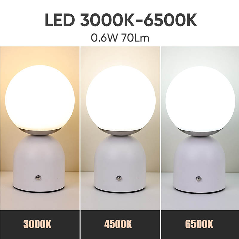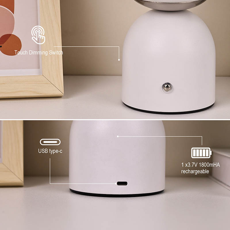 Қара, ақБатареясы бар шағын үстел шамы Қайта зарядталатын құрылғының дизайны қарапайым, жылжымалы және оны безендіру үшін пайдалануға болады. Басы PE қақпағынан тұрады, ал жарық қақпақ арқылы жарқырайды. Жылы түсті жарық өте жұмсақ. Бүкіл сфералық дизайн, төменгі жағы да жарықты реттеуге арналған сенсорлық қосқышпен енгізілген доға тәрізді жарты шар пішіні бар жартылай бүтін металл конструкция. Батареясы бар шағын үстел шамы Қайта зарядталатын батареядан қуат алады, оны USB типті C кабелімен зарядтауға болады.