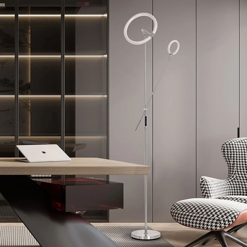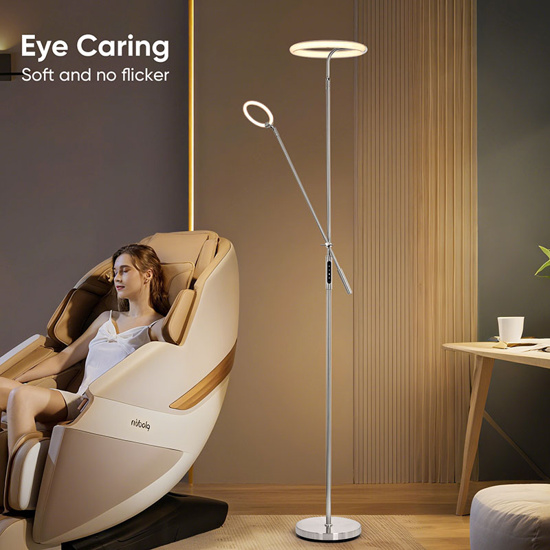 Қоршаған ортаны жарықтандыру дизайны шамдарға бірегей визуалды әсер беріп қана қоймайды, сонымен қатар жарықты тиімді түрде таратады, жарықты жұмсақ әрі біркелкі етеді. Бұл еден шамының шам бағанасы мен негізі тегіс және нәзік бетімен және қолмен жайлы сезіммен жақсы жылтыратылған және өңделген,